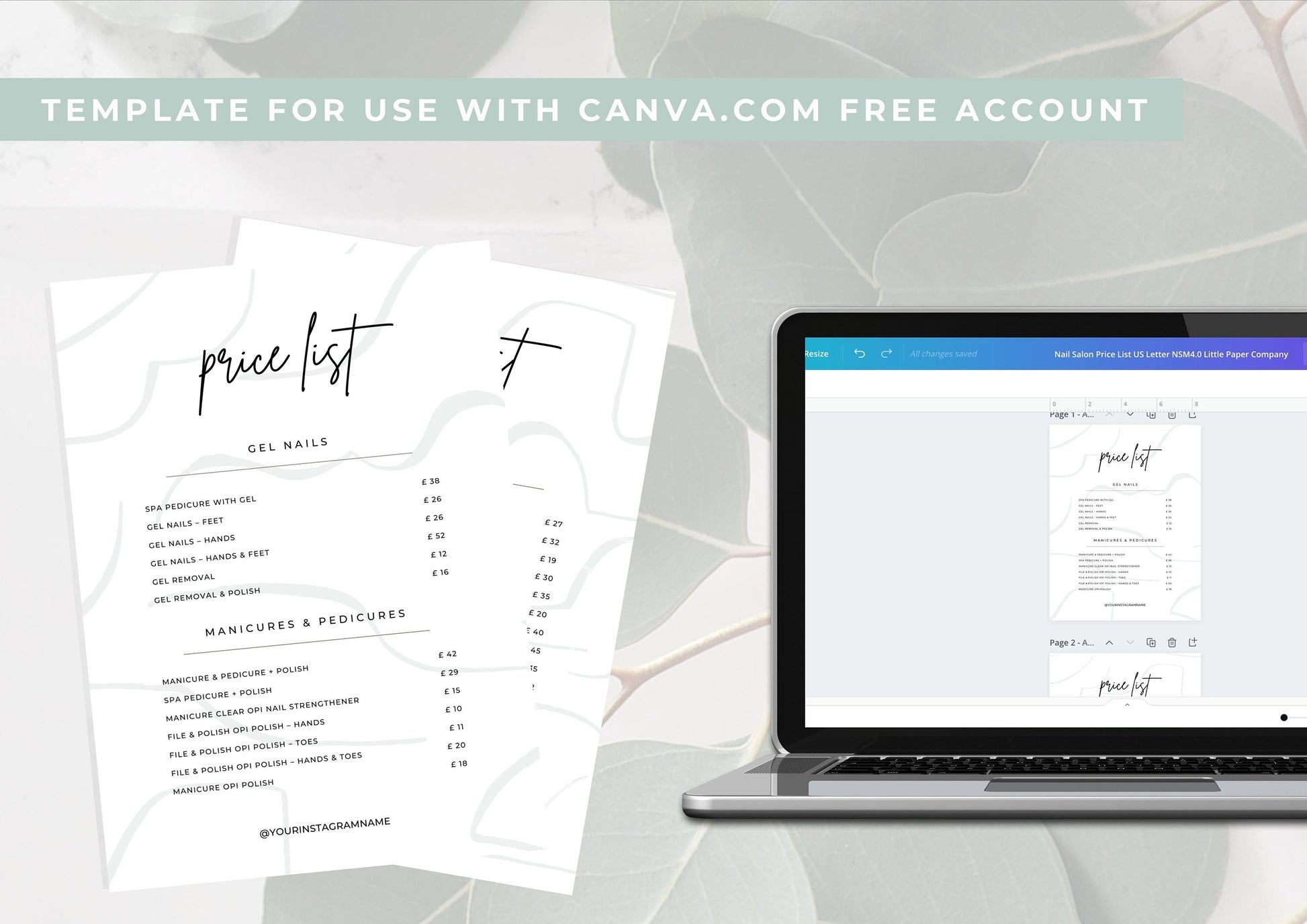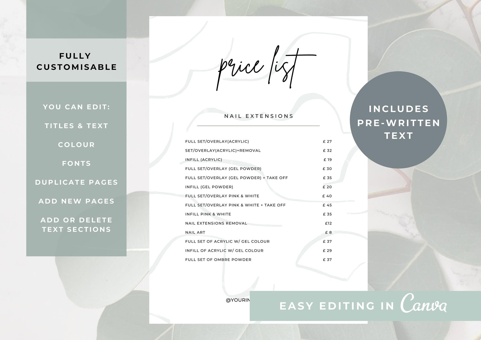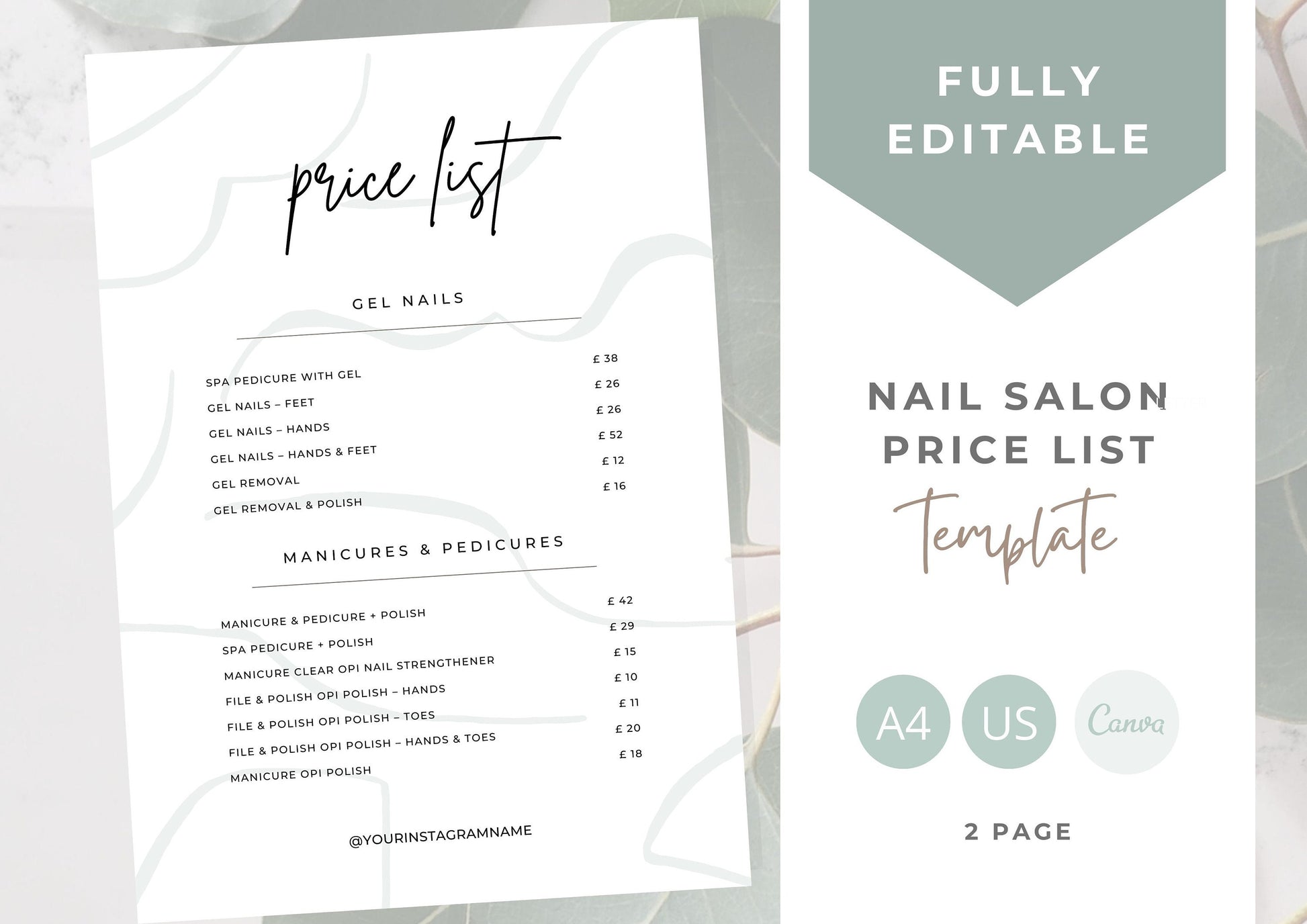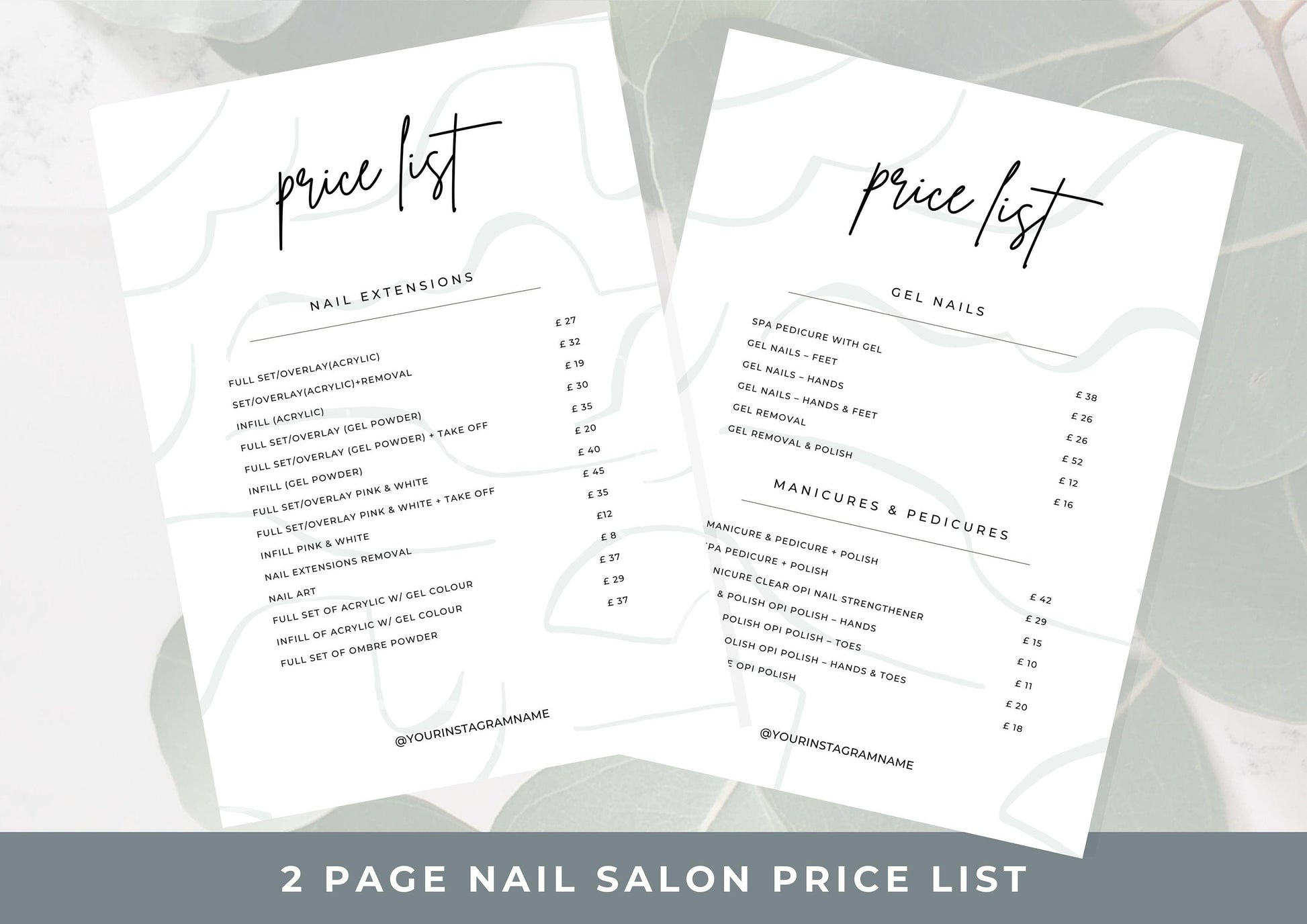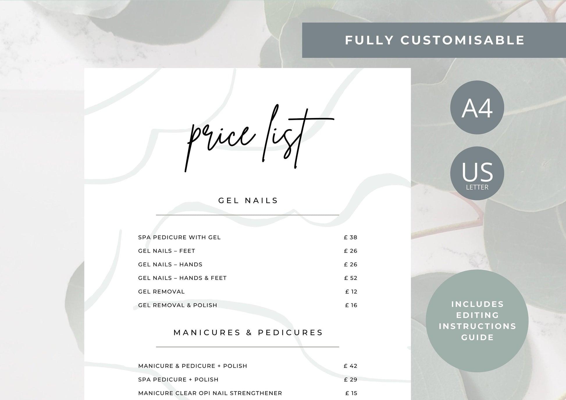 • 2 Page Fully Customisable Nail Salon Pricing Menu Template in A4 & US Letter sizes